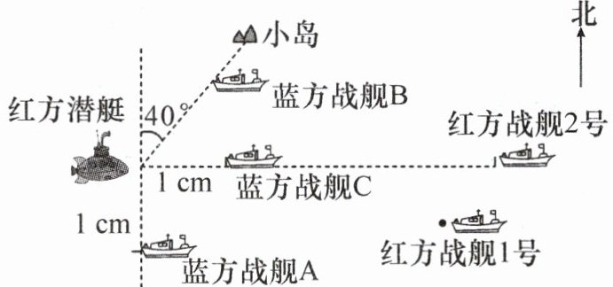 (1)对红方潜艇来说,北偏东$40^{\circ}$的方向上有两个目标:蓝方战舰B和小岛。要想确定蓝方战舰B的位置,还需要知道蓝方战舰B与红方潜艇之间的距离。
