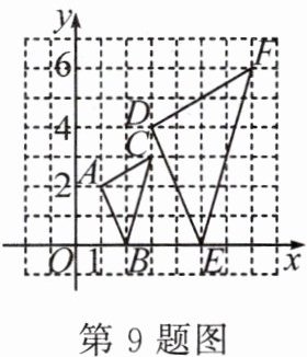 9. (2023·遂宁)在方格图中,以格点为顶点的三角形叫做格点三角形.在如图所示的平面直角坐标系中,格点三角形 ABC 和格点三角形 DEF 成位似关系,则位似中心的坐标为