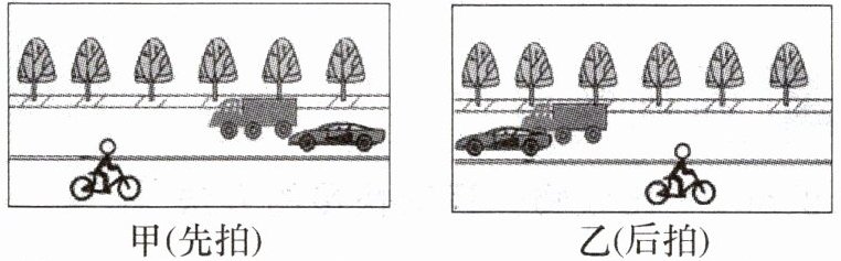 13. 小明在马路边上拍街景照片,连续拍了两张,如图甲、乙所示,如果卡车是向西运动的,以行驶的卡车为参照物,树是
