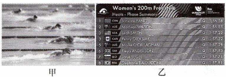 1. 如图所示,图甲为观众看到的游泳比赛现况,观众能判断此时谁游得更快是通过