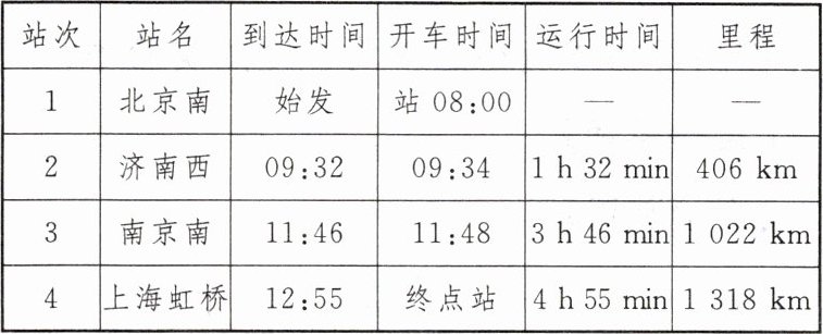 12. 北京一零一校本经典题 小轩假期去上海姑姑家探亲,坐上北京南站到上海虹桥站的某次高速列车,看到了该列车的运行时刻表如表所示:
