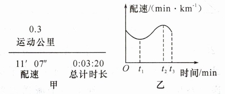 s。若他的“配速”随时间变化的图像如图乙所示,可知,他在t₁