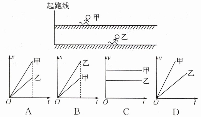 3. (2024·石家庄长安区期末)甲、乙两位同学进行百米赛跑,假如把他们的运动近似看作匀速直线运动,他们同时从起跑线起跑,经过一段时间后他们的位置如图所示,如图是在这段时间内两人运动的路程$s$、速度$v$与时间$t$的关系图像,正确的是(