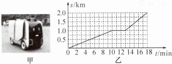 4. (2024·石家庄41中期中)无人快递派送车已应用于很多大学城,如图甲所示,该车从快递驿站出发,$10min$后到第一个派送点停靠并派送快递,完成任务后再次出发开往下一个派送点,其路程$s$与时间$t$的关系如图乙所示。则下列说法正确的是(