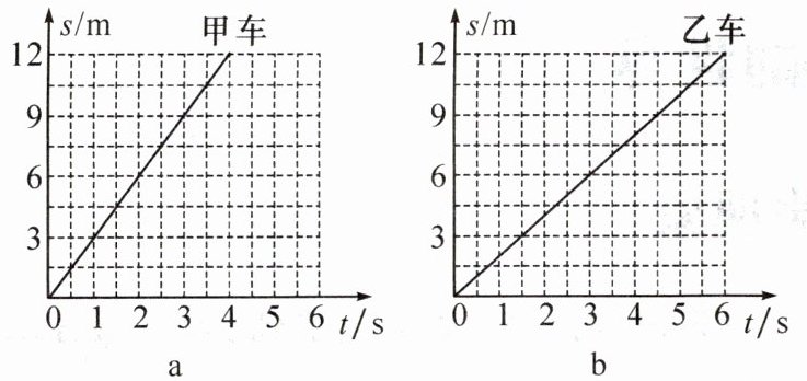 4. (2024·自贡)P、Q 是同一直线上相距 12 m 的两点,甲、乙两小车同时经过 P 点向 Q 点做直线运动,它们的 s-t 图像分别如图 a、b 所示。则(