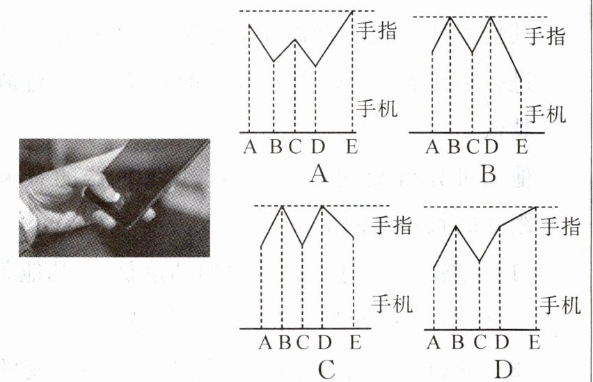 11. 如图所示,某手机内置有超声波指纹识别系统,手机发出超声波遇到手指上凸凹不平的指纹中A、B、C、D、E五个位置,测得回收信号的时间分别为0.27 ms、0.41 ms、0.27 ms、0.41 ms、0.19 ms,则该处指纹的大致形状是(