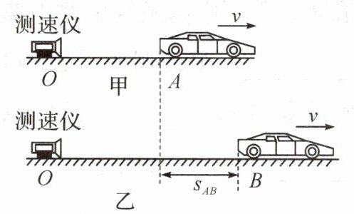 14. 为了监测超速行驶的违法行为,公路上常常设置有超声波测速仪,如图为某公路直线路段的一处测速仪,测速仪能发射和接收超声波。当行驶的小车距离测速仪sOA=62 m时(如图甲),测速仪向小车发出超声波,超声波“追上”小车时,小车刚好运动到B点(如图乙)。测速仪从发出超声波到接收反射回来的超声波所用的时间为0.4 s。超声波的速度为340 m/s。求:
