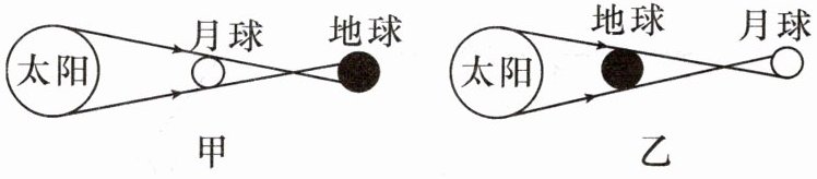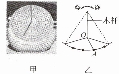 形成的。在野外我们也可以利用影子辨别方向,如图乙,中午前后,用描点的方法在地面上画出竖直杆阴影顶端的运行轨迹,找出其中距$O$最近的点$A$,则$OA$就指示南北