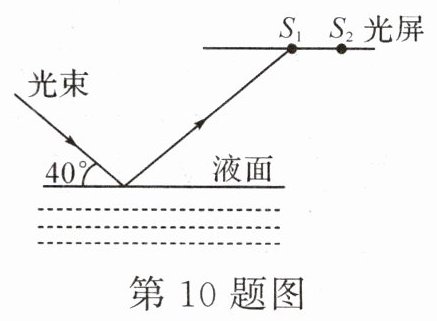 10. (2024·石家庄桥西区期末)如图所示,一束入射光与液面的夹角保持 40°不变,经液面反射后在光屏上形成亮点 S₁,此时反射角为