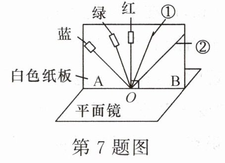 7. 如图所示,小海同学在“探究光的反射定律”实验中,利用红、绿、蓝三种色光的激光笔进行实验,他将位于同一平面内的白色纸板立在平面镜上。下列说法中正确的是(