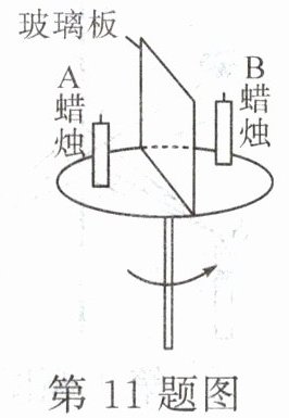 11. (2022·济宁)在校园科技节活动中,小明观看了“隔着玻璃吹蜡烛”的魔术。表演者介绍图中的道具后旋转平台,使玻璃板一侧正对观众,分两步完成了表演:①用两个打火机同时“点燃”两支蜡烛;②在玻璃板正对观众的一侧吹A蜡烛。观众看到两支蜡烛同时被“吹灭”。小明利用道具,和同学们一起探究其中的奥秘。