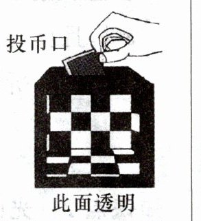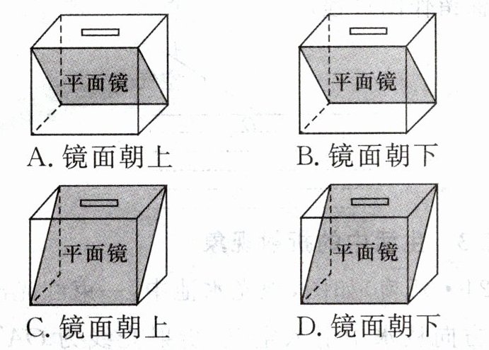 11. 小明在科技节中表演魔术:从投币口投入只有正面透明的棋盘格空箱的硬币消失了!随后他揭秘:这是平面镜和棋盘格共同形成的结果。下列放置平面镜的方式能实现这个魔术效果的是(