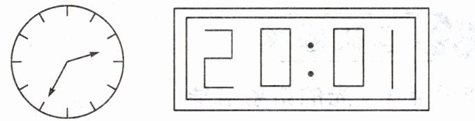 14. 小明从平面镜里看到镜子对面石英挂钟和电子钟所成的像如图所示,这时石英挂钟和电子钟显示的时间分别是