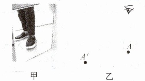 15. (2024·石家庄新华区期末)小明在某商场买鞋,他选了一双新鞋在倾斜放置的“试鞋镜”前试穿,他在镜中看到了新鞋的像,如图甲所示。图乙中$A'$是鞋上一点$A$在平面镜中的像,请在图乙中画出平面镜的位置,并作出小明通过平面镜看到$A$点的光路图。
