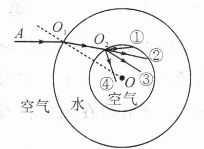 14. 在天宫课堂中,航天员王亚平将空气注入水球,形成的气泡球与水球的球心都在O点。一束光从空气射入水球的光路如图所示,其中球心O与入射点O₁的连线为法线。则进入气泡球的折射光线可能为(