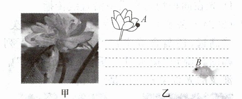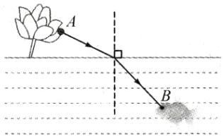 16. 如图甲是一名摄影爱好者拍摄到的鱼儿咬食荷花的场景,请在图乙中画出鱼未出水面时看到荷花的大致光路图,A 表示荷花、B 表示鱼眼。
