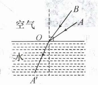 13. 如图所示,$ OA' $ 是入射光线 AO 的折射光线,请在图中画出入射光线 BO 的反射光线和该入射光线在水中的折射光线的大致方向。