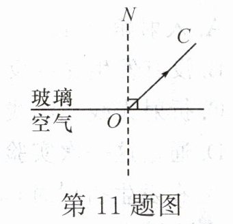 11. (2024·通辽)一束光从玻璃斜射入空气中时,在玻璃与空气的交界面上发生了反射和折射,反射光线 OC 如图所示,请在图中画出入射光线 AO 和折射光线 OB 的大致方向。