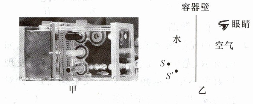 18. (2024·菏泽)2024 年 4 月 26 日,神舟十八号载人飞船成功对接中国空间站,装有 4 条斑马鱼的特制透明容器顺利转移到问天实验舱,如图甲所示。请你在图乙中画出航天员看到斑马鱼的光路图(S 表示斑马鱼的实际位置,$ S' $ 表示航天员看到的斑马鱼的像的位置,不考虑容器壁对光线的影响)。