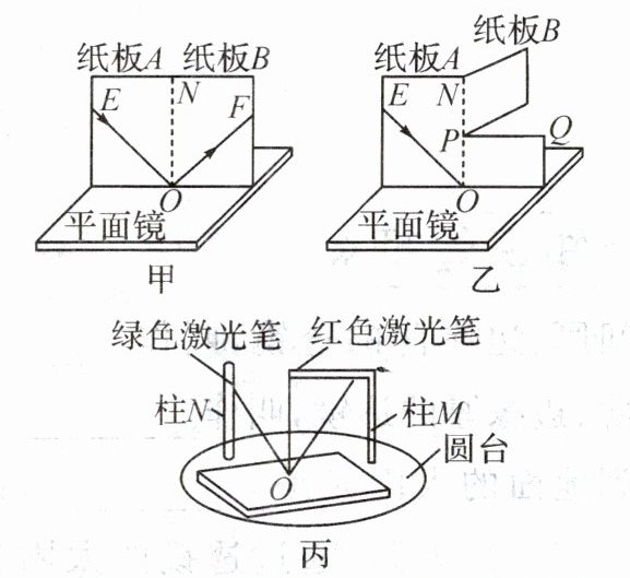 (5)接下来老师进行了如下演示(图丙):先用加湿器使整个教室充满雾气,将平面镜放在一能转动的水平圆台上,在柱M上固定一红色激光笔,使其发出的光垂直射向平面镜上的O点,其作用是为了显示法线的位置。然后打开固定在柱N上的绿色激光笔,使绿色激光射向O点,出现了如图丙所示的情景。老师水平方向缓缓转动圆台,当观察到,也可得出与(4)一致的结论。