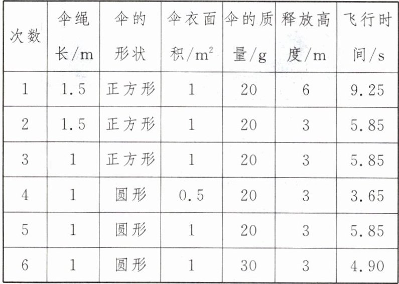 (2)在绳长、总质量、释放高度相同时,伞衣面积越大,伞的飞行时间越长
