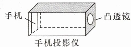 10. (2024·聊城)在学习了凸透镜成像规律后,小慧同学计划制作一个“手机投影仪”。现有器材如下:焦距分别为10 cm、20 cm、30 cm的凸透镜各一个,手机一部,长为30 cm的纸盒,胶带和剪刀等。“投影仪”模型如图所示,将手机和凸透镜分别固定在纸盒的两端,调整“投影仪”到墙面的距离,可在墙上看到手机画面清晰放大的像。下列说法正确的是(