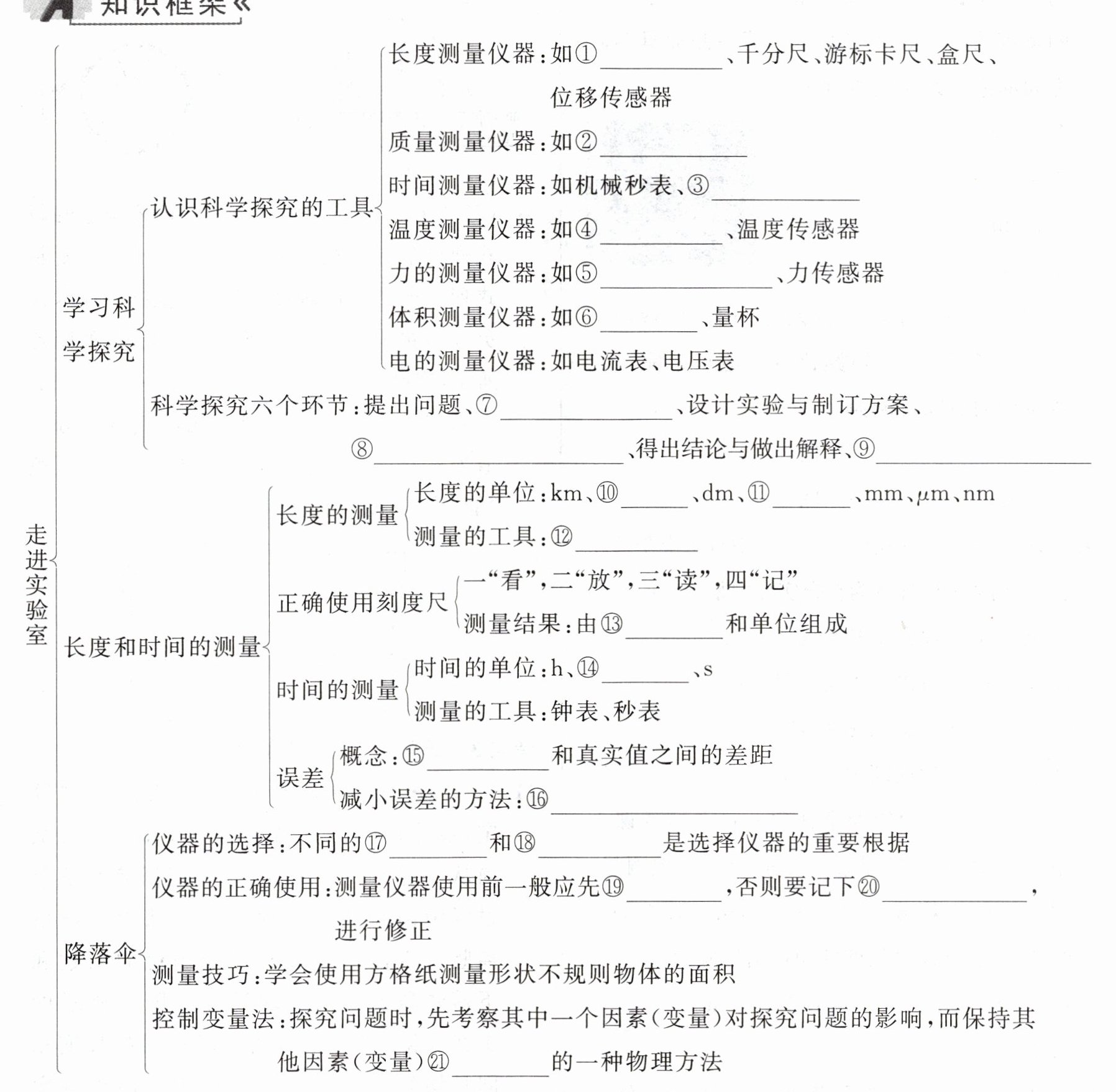 ①刻度尺 ②托盘天平 ③电子秒表 ④温度计 ⑤弹簧测力计 ⑥量筒 ⑦猜想与假设 ⑧进行实验与收集证据 ⑨交流、评估和反思 ⑩m ⑪cm ⑫刻度尺 ⑬数值 ⑭min ⑮测量值 ⑯多次测量取平均值 ⑰量程 ⑱分度值 ⑲调零 ⑳初始读数 ㉑不变
