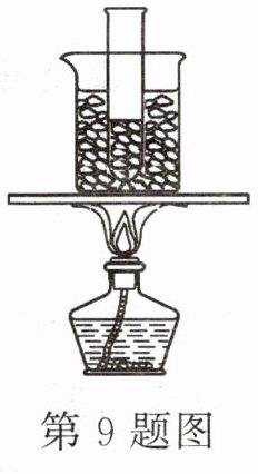 9. 把盛有碎冰块的大试管插入烧杯里的碎冰块中,如图所示。用酒精灯对烧杯底部慢慢加热,当烧杯中的冰块有大半熔化时,试管中的冰(