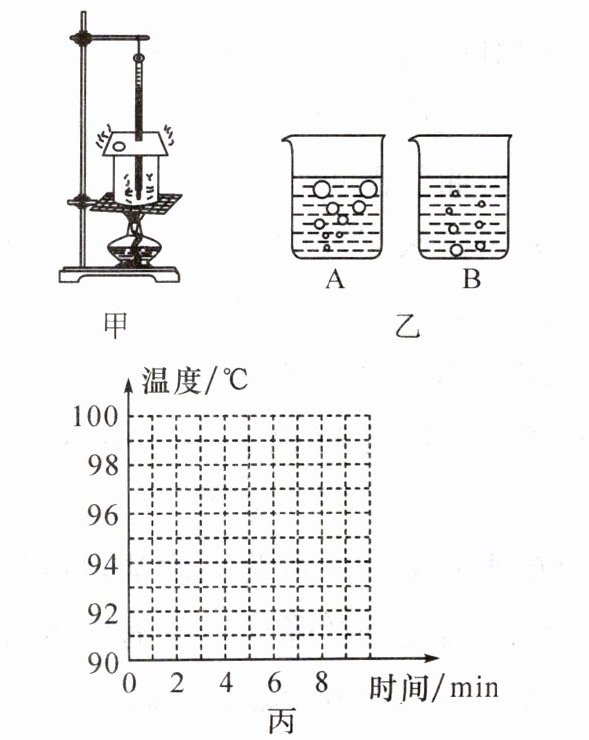(填“A”或“B”)是水沸腾后的情况。(3)根据实验数据在图丙中描点画出温度随时间变化的图像。