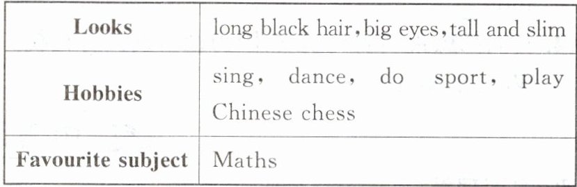 I am thirteen years old. I live in Shanghai now. I study in No. 1 Middle School. I am in Class 4,Grade 7. I have long black hair and big eyes. I am tall and slim. I have a lot of hobbies. I like singing and dancing. I often do sport at the weekend. I am also good at playing Chinese chess. It’s very fun. I am interested in Maths. I am always ready to help my friends with their Maths problems.