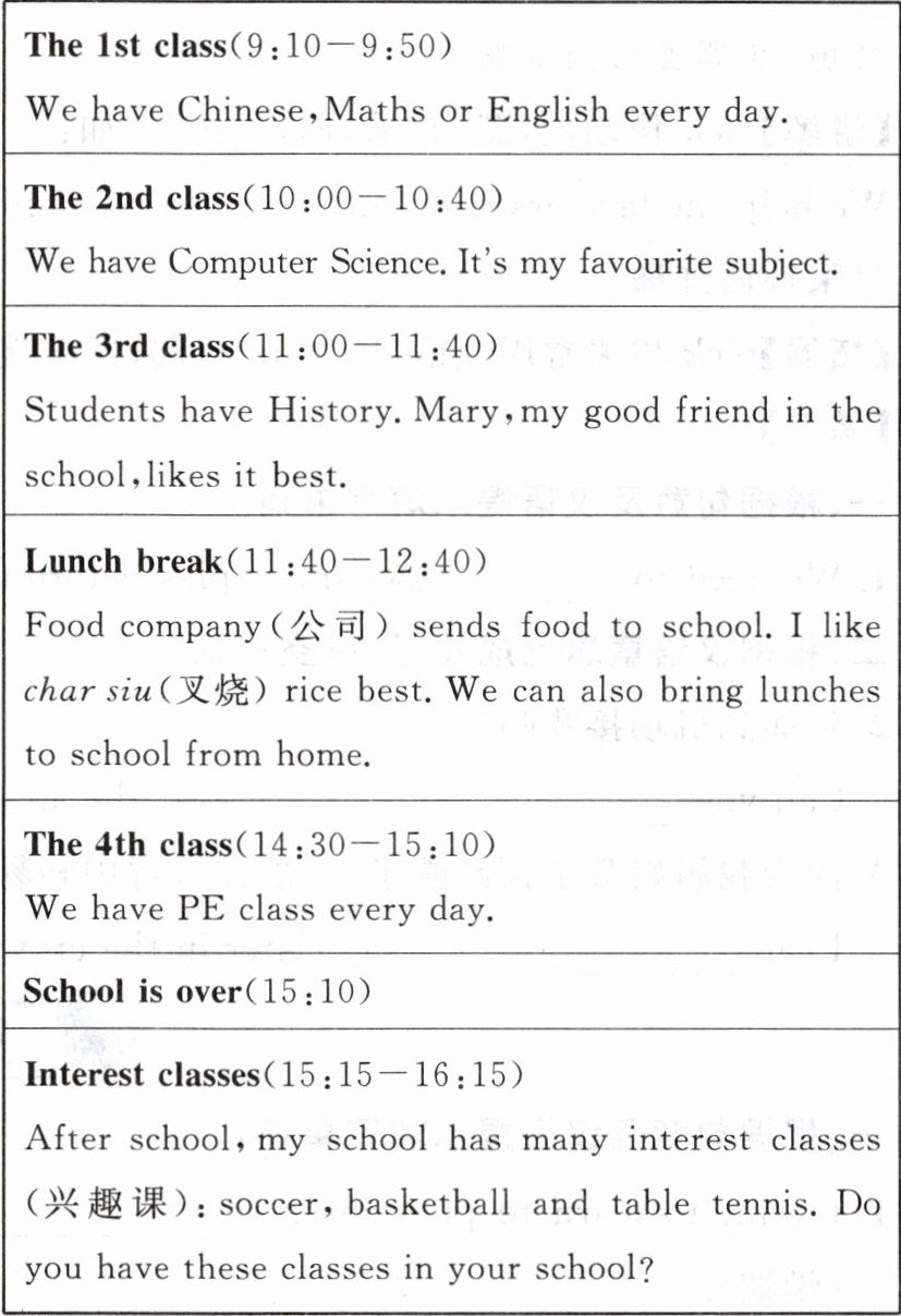)29. When can students there have table tennis class?A. After lunch. B. After school. C. After interest classes.