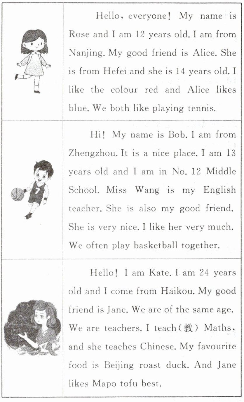 I’m Jane. I have many teachers now and I love them all, but I think I love my English teacher Sophia best. Sophia is from the UK. But she loves Chongqing very much. She thinks Chongqing is great. She loves Chongqing food. Do you know what she likes for breakfast? Bread and milk? No, she doesn’t. She only has noodles. Hot pot is her favourite and she always eats it on Saturdays and Sundays. Sophia lives with her daughter and her son. Her daughter’s name is Mary. Her son’s name is Jack. They are 8 years old. They go to the same school. They like hot pot too. They are in Chongqing now. Her husband(丈夫)lives with her another(另一个)child in England.