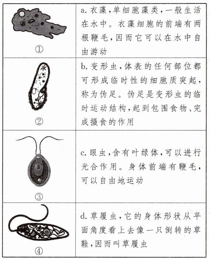 2. 如下表左列①~④表示某些单细胞生物,右列是这些单细胞生物的资料卡片(左右并不对应)。你认识这些单细胞生物吗?请在下方横线处写出它们对应的资料代号。