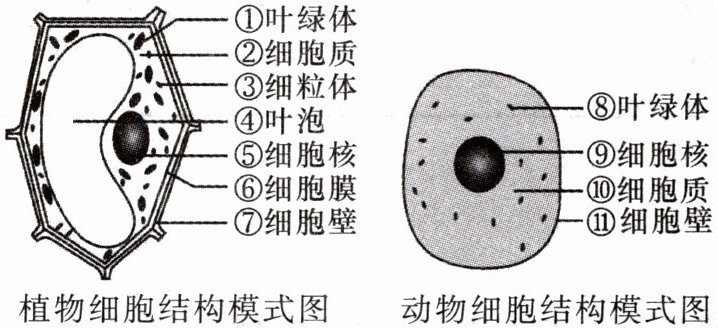 11.(陕西中考)小秦学完“生物体的结构层次”主题内容后,围绕以下三个问题,与小组同学继续进行合作学习,邀请你加入并回答问题。下面是小组同学作业中标注的动植物细胞结构模式图。