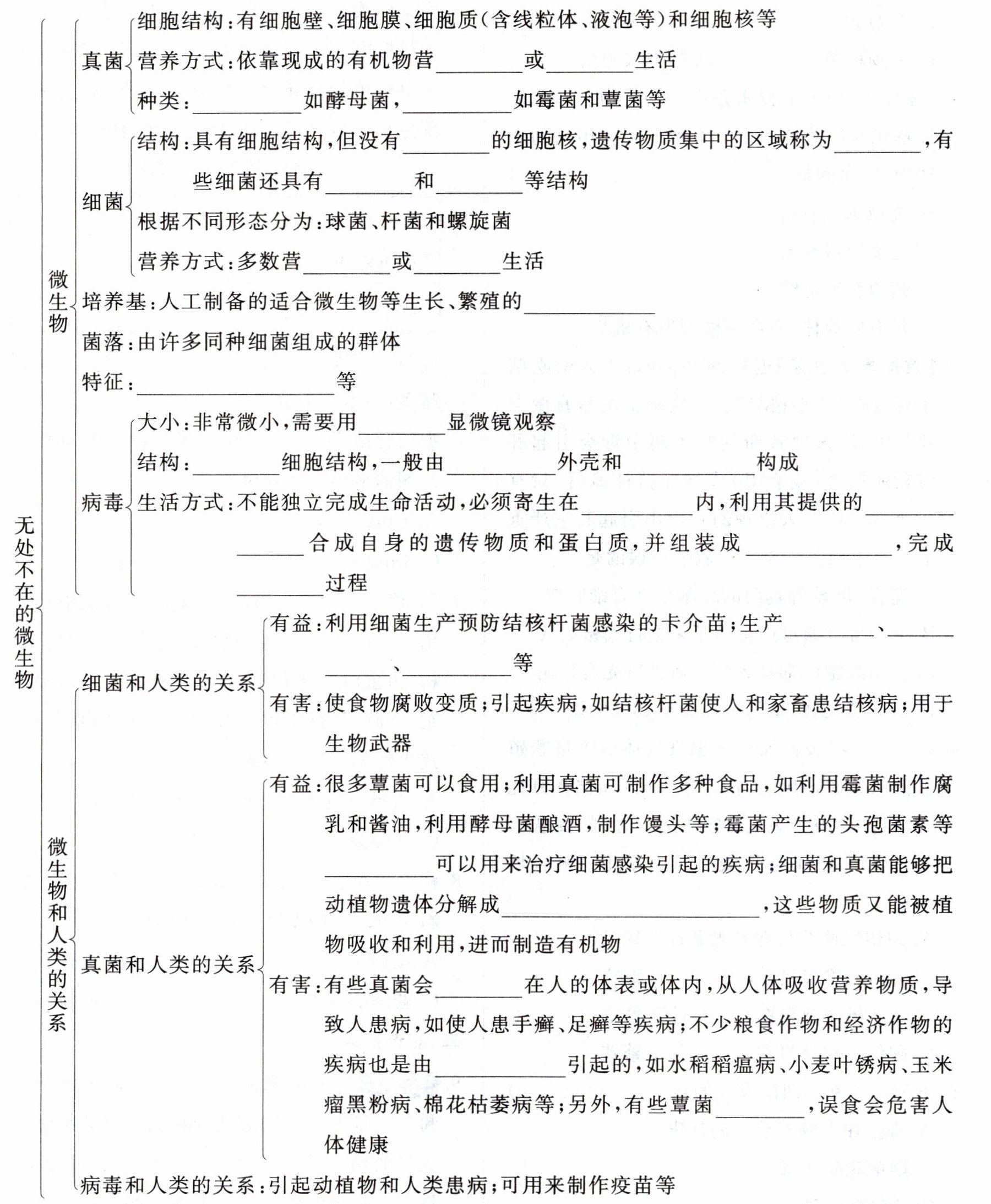 答案: 腐生 寄生 单细胞 多细胞 成形 拟核 荚膜 鞭毛 腐生 寄生 营养基质 颜色、大小、形状 电子 没有 蛋白质 遗传物质 活细胞 物质和能量 子代病毒 增殖 味精 细菌肥料 杀虫剂 抗生素 二氧化碳、水和无机盐 寄生 真菌感染 有毒