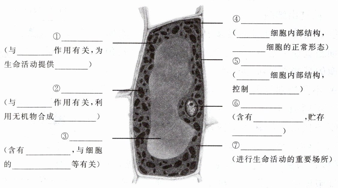 2、①线粒体 呼吸 能量 ②叶绿体 光合 有机物 ③液泡 细胞液 吸水和失水④细胞壁 保护 维持 ⑤细胞膜 保护 物质进出 ⑥细胞核 遗传物质 遗传信息 ⑦细胞质 细胞壁 细胞膜 细胞质 细胞核 线粒体、叶绿体和液泡