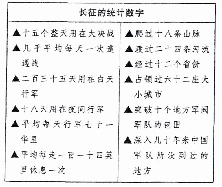 【示例】行军路途遥远,自然环境恶劣,敌方围追堵截,遭遇军阀包围,穿越陌生区域,战斗频繁等。(答出任意三点即可)