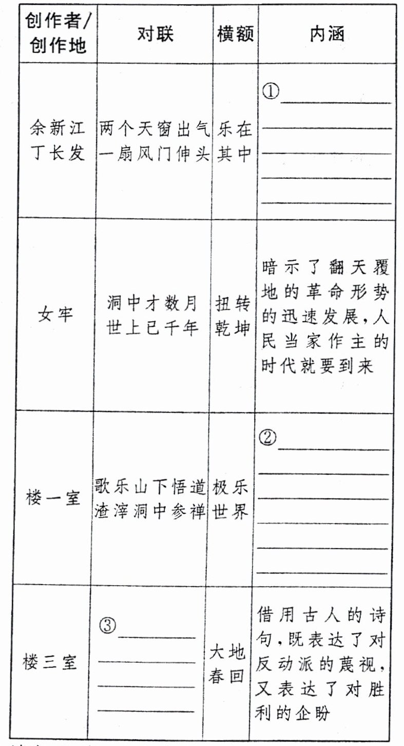 3. 渣滓洞中的革命者在新年大联欢时作了许多对联,请参考示例,结合《红岩》相关内容,将下表补充完整。