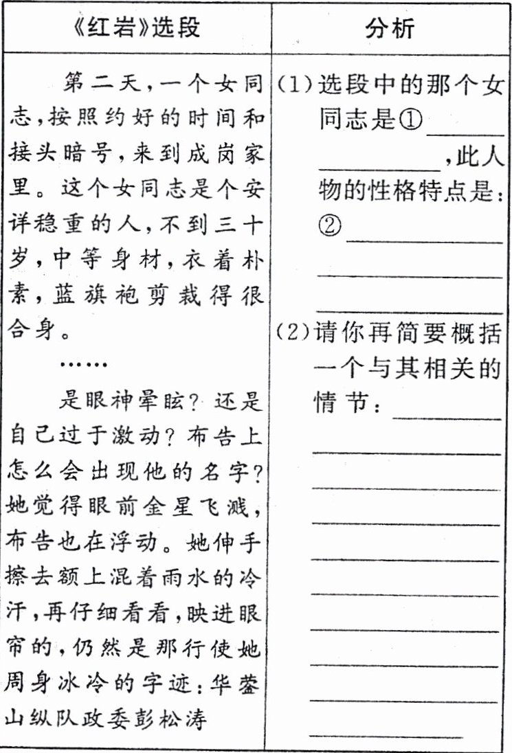2.【示例一】齐晓轩 在越狱战斗的最后时刻,齐晓轩屹立于高耸巨大的岩石上,吸引敌人的火力,以掩护其他同志突围,可见他舍己为人的精神。【示例二】“双枪老太婆”她率领游击队营救江姐,枪毙出卖江姐的叛徒甫志高。可见她智勇双全、疾恶如仇的品质。