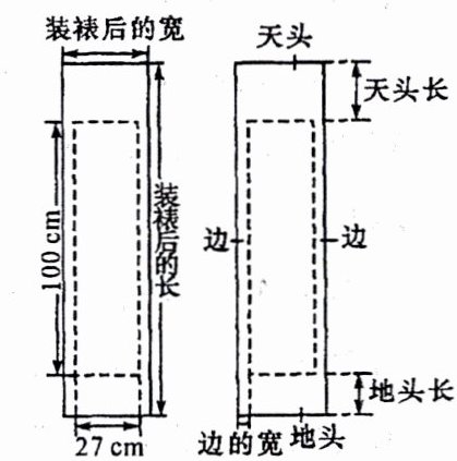 4. (2023·北京)对联是中华传统文化的瑰宝,对联装裱后,如图所示,上、下空白处分别称为天头和地头,左、右空白处统称为边.一般情况下,天头长与地头长的比是 6:4,左、右边的宽相等,均为天头长与地头长之和的 $\frac{1}{10}$.某人要装裱一副对联,对联的长为 100 cm,宽为 27 cm.若要求装裱后的长是装裱后的宽的 4 倍,求边的宽和天头长.