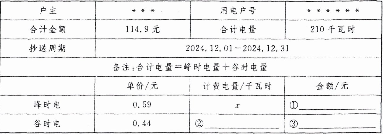 (2)根据题意,得0.59x+0.44(210-x)=114.9,解得x=150。$\therefore210-x=210-150=60。$答:该账单中的峰时电量为150千瓦时,谷时电量为60千瓦时。