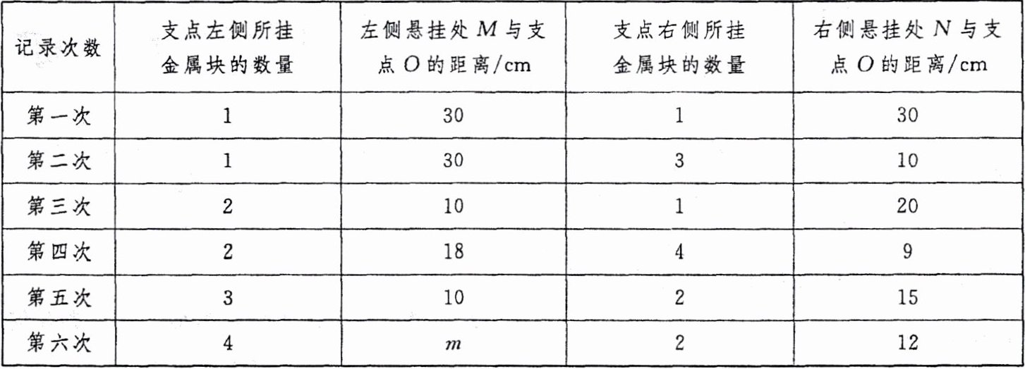 如图 1,小亮用一根两端贴有完全相同的薄防滑片的轻质直杆和 6 个质量相等的小金属块做实验(防滑片的作用是防止悬挂物从直杆两端滑落,直杆和防滑片的质量忽略不计). 已知直杆 AB 的长为 60 cm,以 AB 的中间处为支点 O,在此处拴绳,将直杆吊起. 在支点 O 两侧各悬挂一定数量的小金属块,分别在线段 OA,OB 上调整悬挂的位置,使得直杆保持水平平衡,分别记录此时两侧悬挂处 M,N 与支点的距离,以及两处所挂的小金属块的数量. 然后,改变小金属块的数量,重复以上操作. 小亮在实验过程中记录的数据如下: