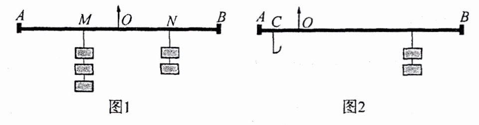 (2)小亮依据上述实验中发现的规律,利用实验中的直杆 AB 和小金属块制作了一把简易杆秤. 如图 2,在距离 A 端 4 cm 的 C 处装了一个用来悬挂被称物体的小挂钩(挂钩的质量忽略不计),将支点 O 设在距离 A 端 12 cm 处,用两个小金属块作为秤砣(每个小金属块的质量均为 0.2 kg).