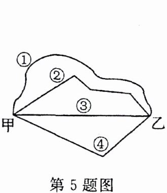 5. 如图,甲、乙两地间有曲线、折线、线段等$4$条路线,则其中路线