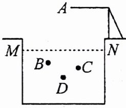 16. 如图,$MN$为一个泳池内的水平面.某跳水运动员(看作一个点)从点$A$处起跳,点$B,C,D$为他三次跳水后落入水中的位置,已知点$B$与点$D$的高度差是$1.5m$,点$C$与点$A$的高度差是$10.5m$.以水面为基准,在水面上方记为正,下方记为负,点$A$表示的是$+7.5m$,点$B$表示的是$-2m$,则点$B$比点$C$高多少?点$D$比点$A$低多少?