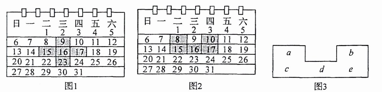 (3)小宇用如图2所示的"凹"字框在月历中任意框中5个数,将这5个数分别用字母a,b,c,d,e表示(如图3).