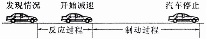 4. 汽车遇到意外情况时紧急停车要经历反应和制动两个过程,汽车在反应过程中做匀速直线运动,在制动过程中做变速直线运动,如图所示。若汽车以 72 km/h 的速度在平直的公路上行驶,紧急停车时,在反应过程中,汽车行驶了 14 m,制动过程所用的时间为 2.3 s,汽车在制动过程中通过的路程为 16 m。