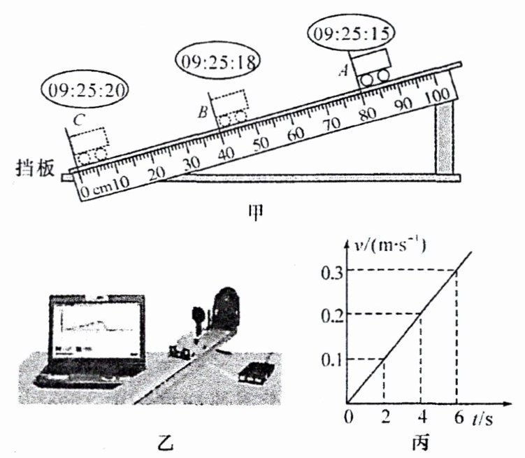 (填“增大”或“减小”)斜面倾角。(4) 小华改进实验,利用如图乙所示的位置传感器测出不同时刻小车与挡板的距离,并用计算机计算出小车在不同位置的速度。计算机绘制的图像如图丙所示,假设斜面足够长,则第 $ 5 \, s $ 时小车的速度为