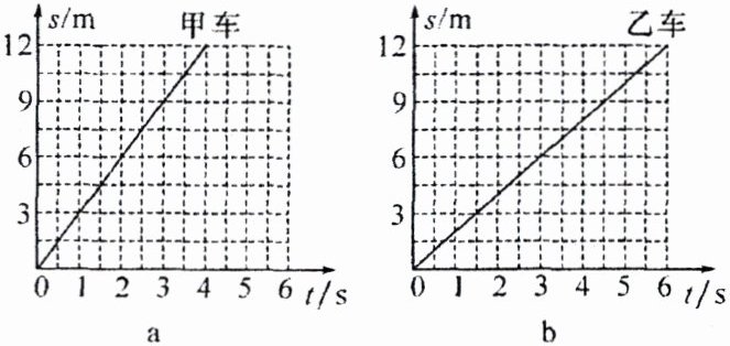 8. (2024·自贡)P、Q 是同一直线上相距 12 m 的两点,甲、乙两小车同时经过 P 点向 Q 点做直线运动,它们的 s-t 图像分别如图 a、b 所示。则(