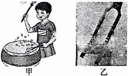 (1)如图甲,小明在鼓面上撒上纸屑,用鼓槌敲击鼓面,鼓面发声,同时鼓面上的纸屑跟着跳动起来;如图乙,再用鼓槌敲击音叉,音叉发声,将发声的音叉放入水中,音叉周围溅起了很多水花。这说明发声的物体都在